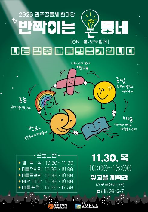 이 밖에도 마을활동가에게 배우는 학습의 장으로 ▲마을평상학교, 마을과 마을의 다양한 이야기를 나눌 수 있는 ▲이야기마당, 광주마을 공동체의 가치와 철학이 담긴 ▲故최봉익 선생 회고전, 마을에서 기획·생산한 상품을 볼 수 있는 ▲마을상회 등 다양한 볼거리와 즐길 거리가 준비되어 있다.
