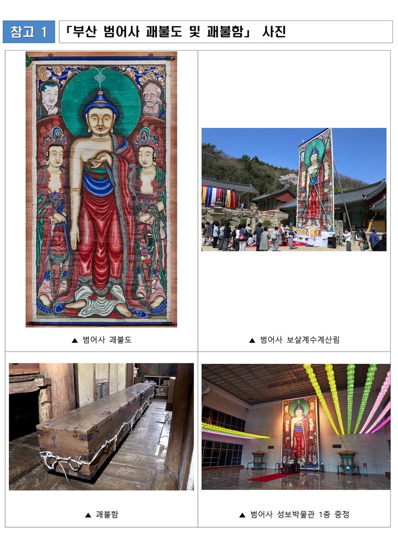 ◈ 3.26. 기준, 시 보유 국가유산은 총 568건… 국가지정 91, 국가등록 23, 시지정 318, 시문화유산자료 129, 시등록문화유산 7 [부산 세계타임즈=이용우 기자] 부산시(시장 박형준)는 「부산 범어사 괘불도(掛佛圖)와 괘불함(掛佛函)」이 지난 3월 18일 자로 국가등록문화유산으로 등록 고시됐으며, 「대혜보각선사서(大慧普覺禪師書)」 1점을 오늘(26일) 자로 시문화유산자료로 고시한다고 밝혔다.