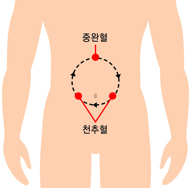 모두 복부에 있는 경혈점으로서 복통, 변비, 설사시 따뜻한 자극을 주거나, 가볍게 지압이나 마사지를 하게 되면 증상의 개선에 도움이 될 수 있다. 한편, 중완, 천추와 배꼽아래를 연결하여 시계방향으로 복부 마사지를 하면 속이 더 편해질 수 있다. [세계타임즈 조원익 기자]