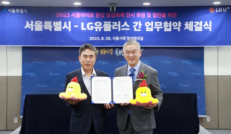 이를 위해 LG유플러스와 서울시는 서울시청에서 ‘2023 서울라이트 한강 빛섬축제 전시후원 및 협찬을 위한 업무협약(MOU)’을 체결했다. 협약식에는 정수헌 LG유플러스 Consumer부문장(부사장)과 유창수 서울시 행정2부시장을 비롯한 관계자가 참석했다.