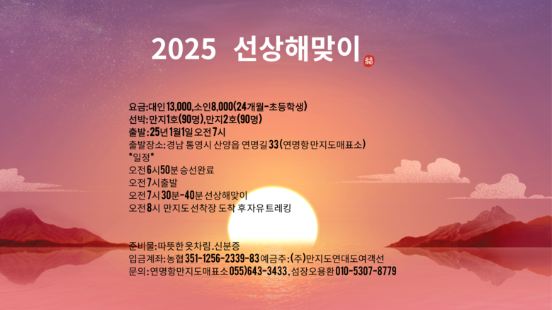 한편 자세한 내용은 만지도연대도여객선 연명항 매표소(055-643-3433)로 문의하시면 됩니다. 새해의 첫날, 통영 만지도와 연대도에서 일출을 보고 산행도 즐길 수 있는 특별한 순간을 만끽해보세요! 자연과 함께하는 새해의 시작, 여러분을 기다리고 있습니다. 원하는 답변이 아닌가요?
