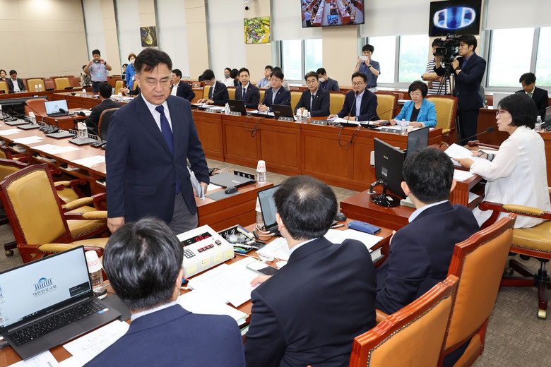 [세계타임즈 = 신상철 기자] 국회 과학기술정보방송통신위원회 최형두 국민의힘 간사가 13일 오전 서울 여의도 국회에서 열린 과방위 전체회의에서 경찰의 방송통신심의위원회 사무실 압수수색과 관련해 긴급 현안질의를 야당이 강행하는 것에 대해 항의하며 퇴장하고 있다. 2024.9.13