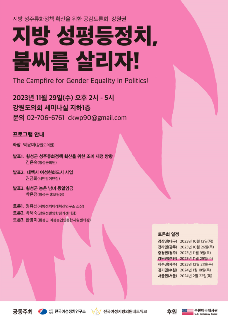 이번 공감토론회는 (사)한국여성정치연구소와 전국여성지방의원네트워크가 공동 주최하고, 주한미국대사관이 후원하는 거버넌스 모델로 지방 성주류화정책의 모범사례를 공유하고 토론함으로써 지방에서 성평등 정치가 안착 될 수 있도록 지원하는 프로그램이다.
