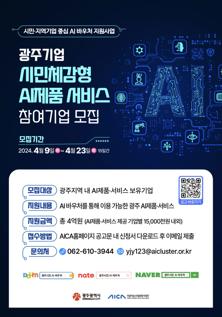 올해 ‘시민‧지역기업 중심 AI 바우처 지원’에 참여하고자 하는 광주지역 인공지능기업은 오는 23일까지 인공지능산업융합사업단 누리집(http://aica-gj.kr)을 통해 지원하면 된다.