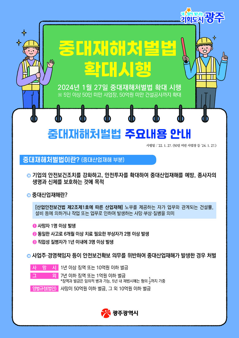 광주시는 27일부터 법 적용을 받게 된 소규모 사업자가 중대재해처벌법을 제대로 알지 못하고 있는 상황을 고려해 지난해부터 홍보활동을 펼쳐왔다.