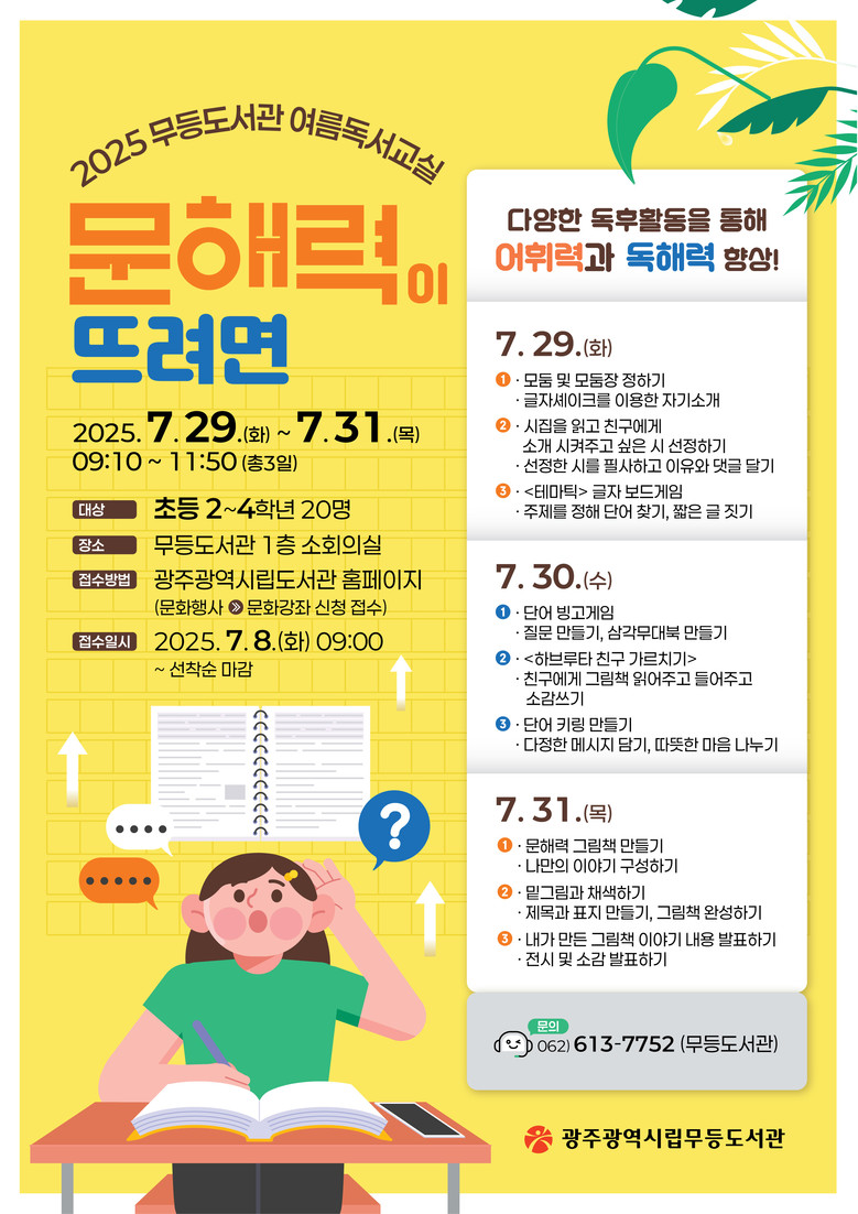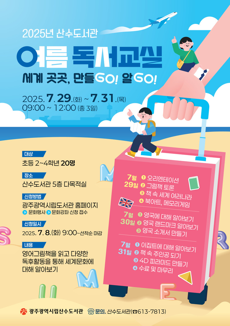 - 사고력·표현력 기르는 맞춤형 프로그램…8일부터 선착순 접수 [광주 세계타임즈=손권일 기자] 광주광역시(시장 강기정)는 여름방학을 맞아 시립도서관 3곳에서 초등학생을 대상으로 하는 체험형 독서 프로그램인 ‘여름독서교실’을 29일부터 31일까지 운영한다.