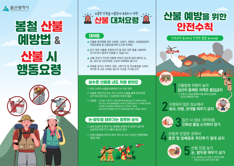 울산시 관계자는 “봄철 산행시 안전수칙 및 산불예방 수칙을 숙지해 산불 예방에 각별히 유의하고, 봄철 재난ㆍ안전사고 예방을 위한 위험 요소는 안전신문고로 신고해 주시길 당부드린다”라고 말했다.