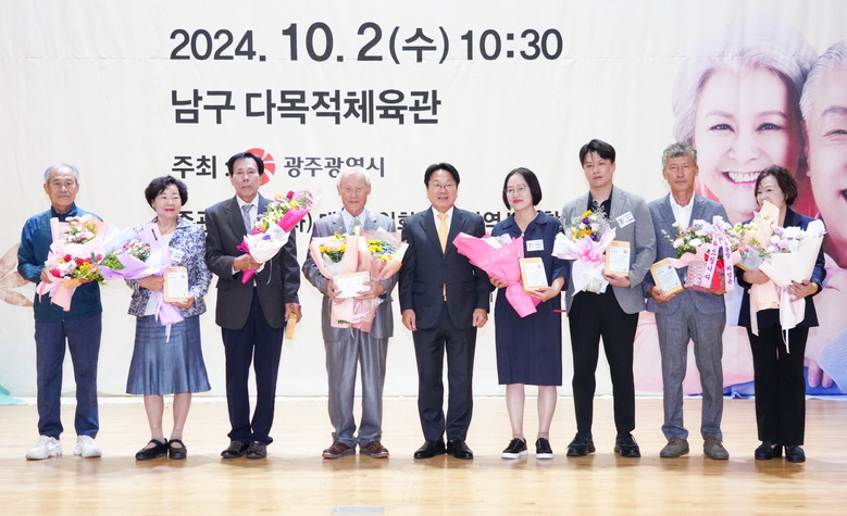 ‘노인의 날’ 유공자에는 유한봉 ㈔대한노인회 광주광산구지회장이 노인복지 기여에 대한 공로를 인정받아 대통령 표창을, 마은주 남구시니어클럽 관장이 국무총리상을 수상했다. 이밖에 보건복지부장관 표창 6명, 광주광역시장 표창에 품앗이노인복지센터 등 시민·단체·공무원 18명이 수상했다.
