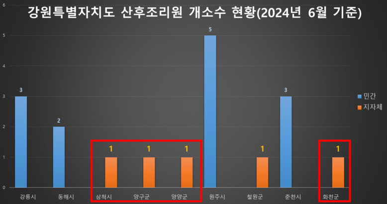 홍성기 의원은 강원도내 공공산후조리원은 5곳(삼척, 철원, 화천, 양구, 양양), 조성 중인 곳은 3곳(속초, 영월, 태백)으로 아직 공공산후 조리원이 없는 도내 시·군은 10곳에 달하고, 민간 산후조리원은 13개소가 있지만 이마저도 춘천, 원주, 강릉, 동해 등 일부 도심 지역에 집중되어 있음을 지적했다.