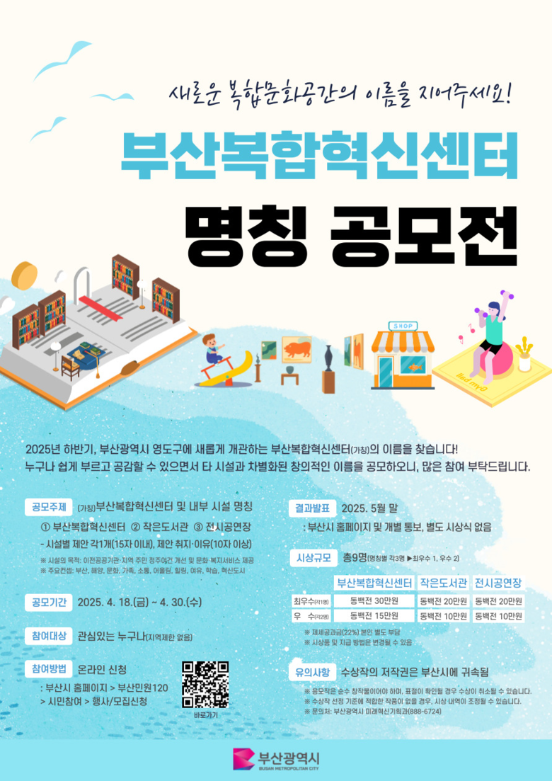 ◈ 당선작은 심사위원회 심사와 시민 선호도 조사 등을 거쳐 오는 5월 중 결정돼… [부산 세계타임즈=이용우 기자] 부산시(시장 박형준)는 영도구 힐링 복합문화공간인 '(가칭)부산복합혁신센터'의 9월 개관을 앞두고, 특색있고 부르기 쉬운 명칭을 선정하기 위한 공모전을 오늘(18일)부터 개최한다고 밝혔다.