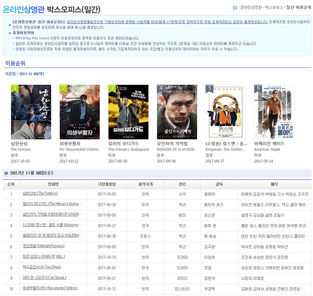 온라인상영관 박스오피스 일간 이용순위는 온라인상영관통합전산망 기본인프라에 연계된 사업자를 대상(현재 KT연계)으로 전자적으로 자동 집계처리되는 일단위 통계정보다.