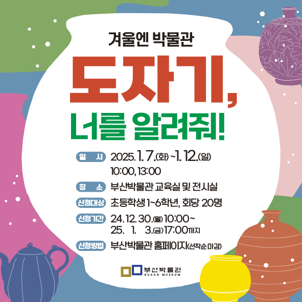 ◈ 겨울방학을 맞아 우리 도자기를 다양한 활동을 통해 알아볼 수 있어 [부산 세계타임즈=이용우 기자] 부산시립박물관(이하 부산박물관)은 오는 30일부터 내년 1월 3일까지 초등학생 대상 교육프로그램 <겨울엔 박물관 – 도자기, 너를 알려줘!>의 참가자를 모집한다고 밝혔다.