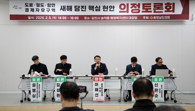 [충남 세계타임즈=이현진 기자] 충남도의회는 5일 당진시 송악읍 행정복지센터 대강당에서 ‘도로·철도·항만·경제자유구역, 새해 당진 핵심 현안’을 주제로 의정토론회를 열고, 당진 지역 대형 SOC 및 산업 인프라 사업의 추진 현황과 대응 방안을 종합적으로 논의했다.