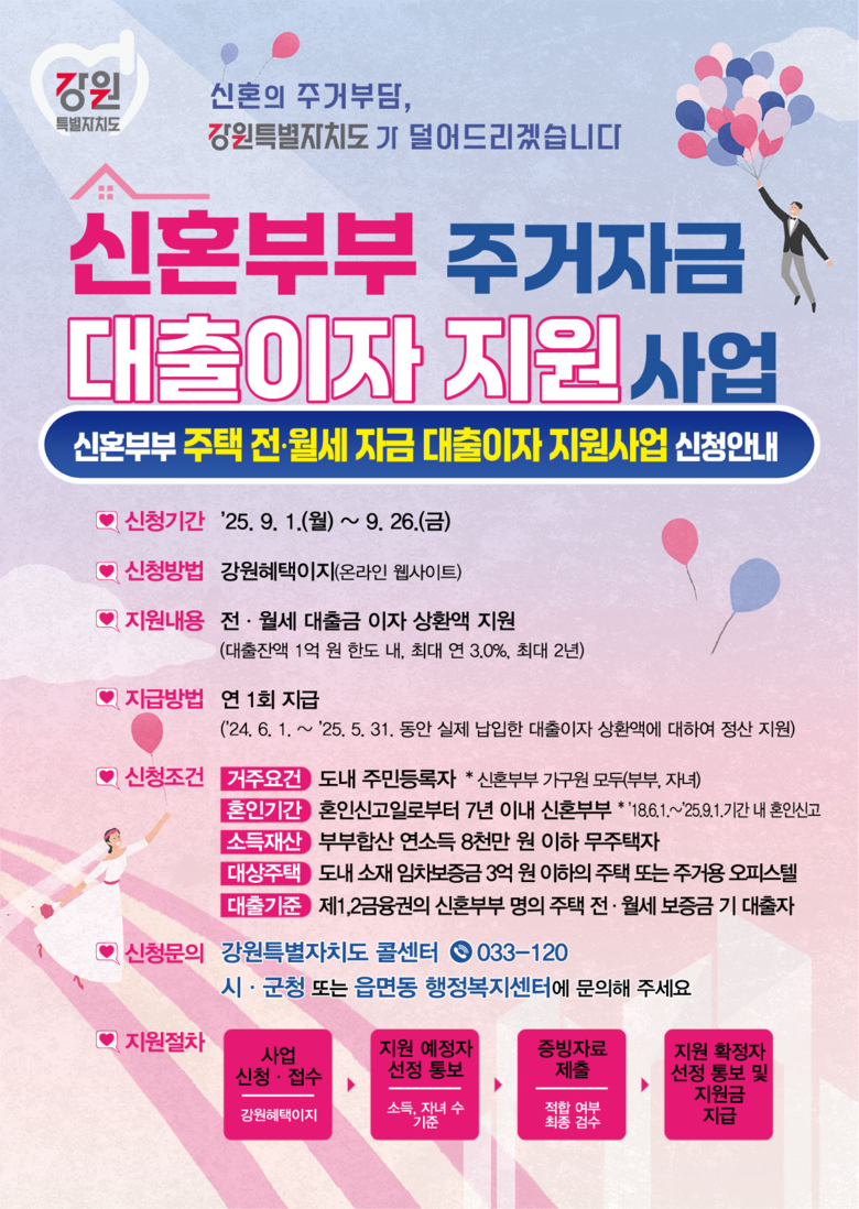 김순하 강원특별자치도 건축과장은 “이번 사업이 결혼 초기 높은 주거비 부담을 덜어 신혼부부의 안정적인 정착에 실질적인 도움이 되길 바란다”며, “앞으로도 도내 신혼부부를 위한 실효성 있는 주거지원 정책을 적극 추진하겠다”고 말했다.
