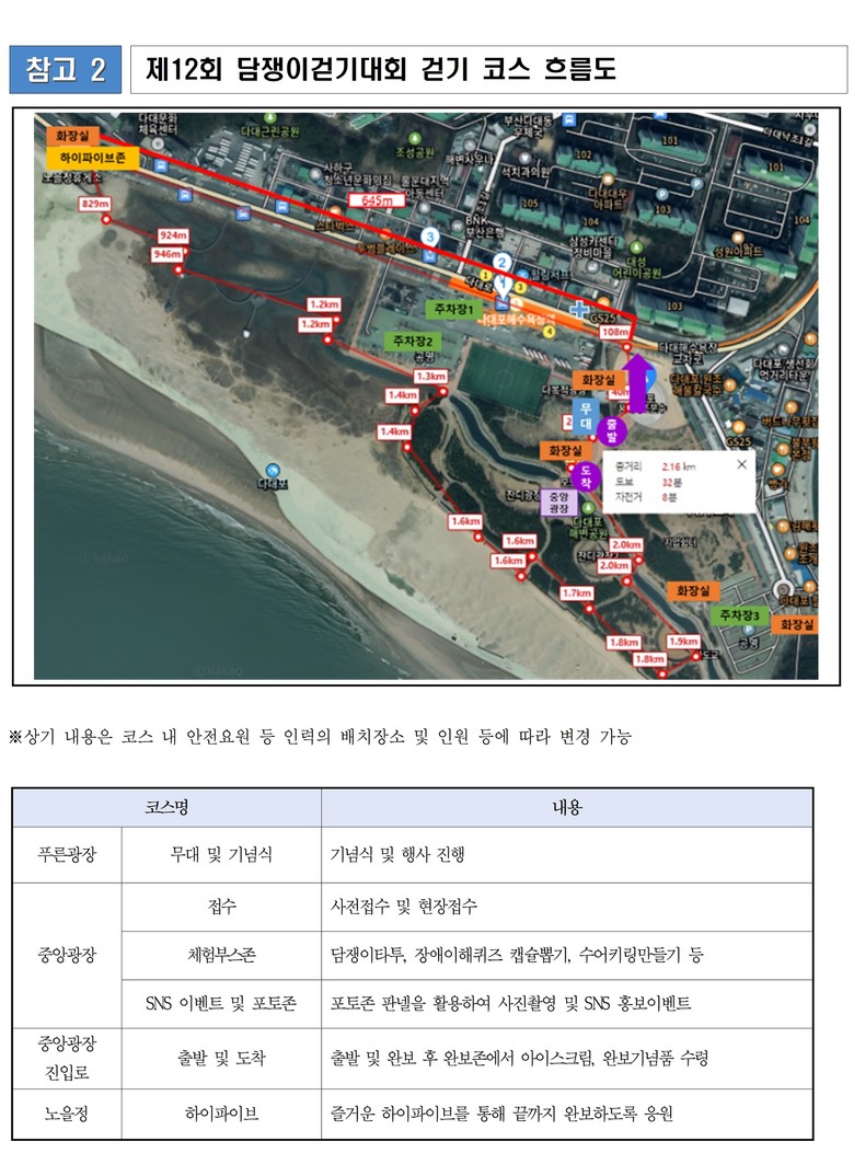 걷기대회는 ▲다대포 해변 푸른광장에서 시작해 ▲다대포 낙조분수 ▲노을정 ▲다대포 생태탐방로를 지나 다시 출발지로 돌아오는 2.1킬로미터(km) 코스로, 완주까지 약 1시간이 걸린다.