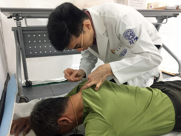 | ▲창원자생한방병원 의료진이 진료소를 찾은 농민에게 침치료를 실시하고 있다.