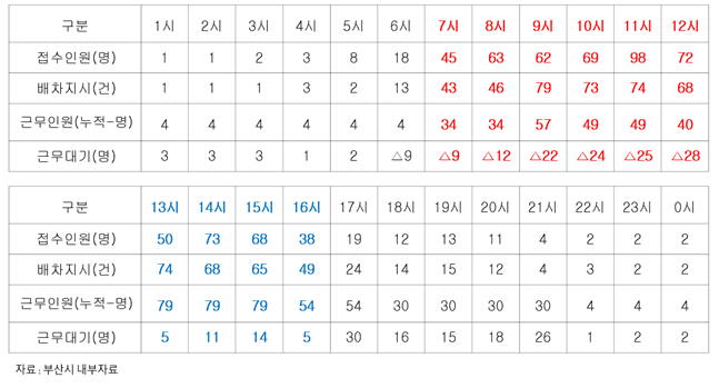 그리고 오전 첨두시간에는 접수건수에 비해 근무자가 부족하여 배차지시가 원활하지 않은데 이는 인력 충원을 통해 비번 차량을 추가 배정하고 근무시간을 재배정한다면 상당 부분 개선이 될 수 있는 부분으로 보았다.