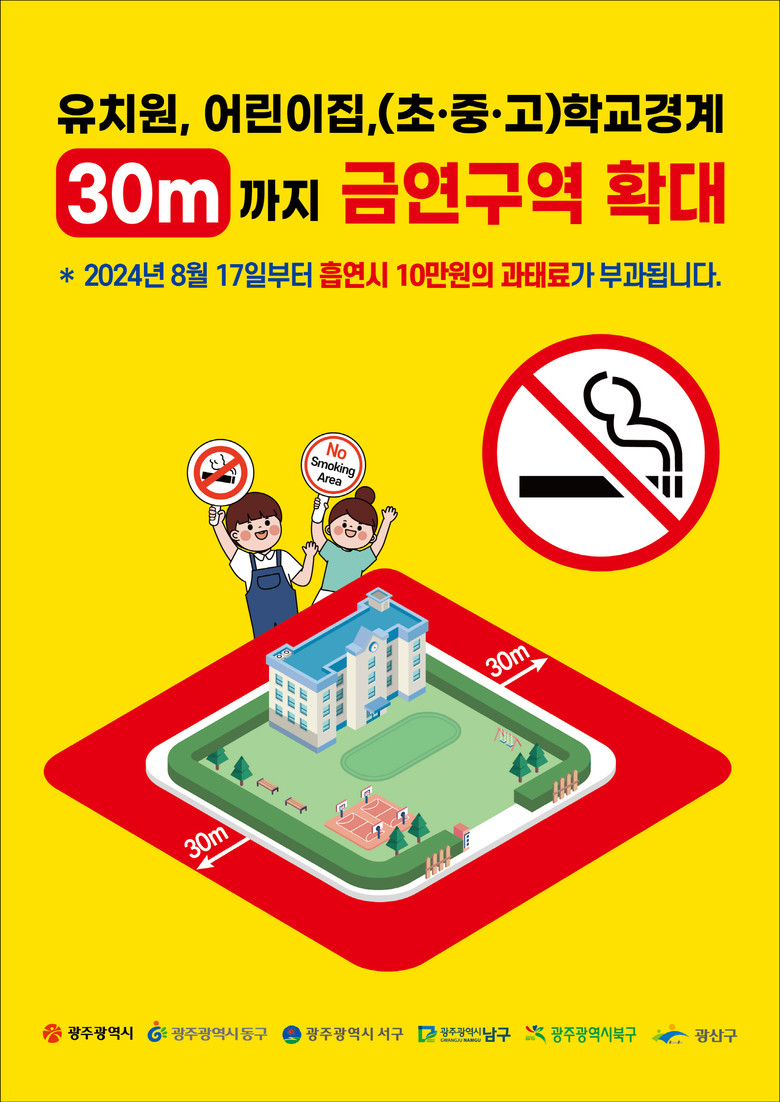 - 개정 국민건강증진법 17일부터 시행…“어린이‧청소년 건강보호” [광주 세계타임즈=손권일 기자] 광주광역시(시장 강기정)는 오는 17일부터 유치원과 어린이집, 학교 주변 금연구역이 확대된다.