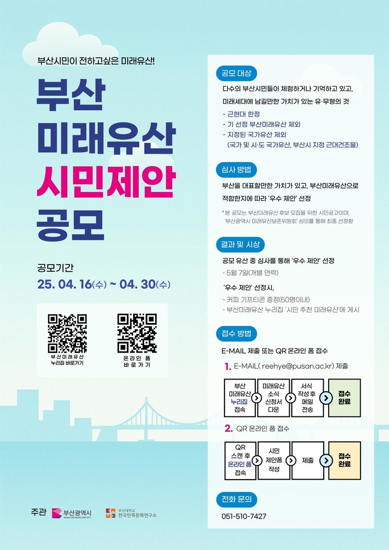 공모 최종 결과는 오는 5월 7일 발표될 예정이며, 기타 자세한 사항은 부산미래유산 누리집 내 미래유산 소식(www.busan.go.kr/futureheritage/future03) 또는 시 문화유산과 유산활용등재팀(☎ 051-888-5094, 510-7427)으로 문의하면 된다.