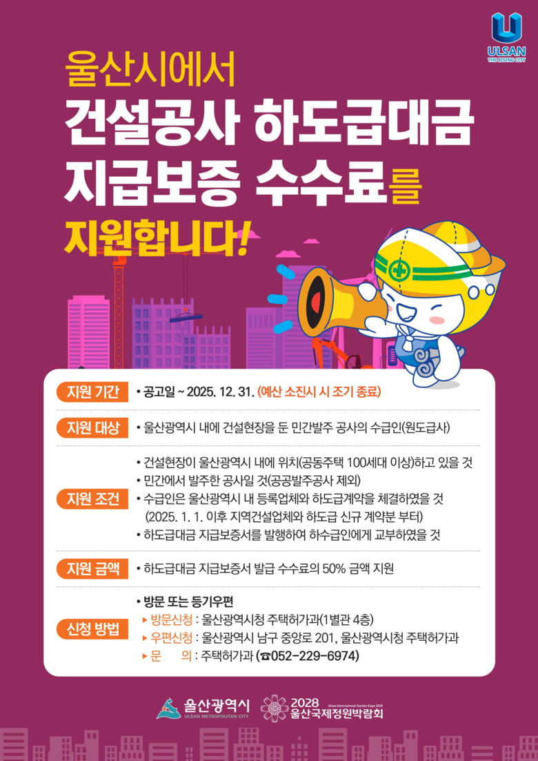지원 대상은 올해 1월 1일 이후 울산지역 건설업체와 하도급계약을 체결한 민간 발주 공사(공동주택 100세대 이상)의 수급인이다.