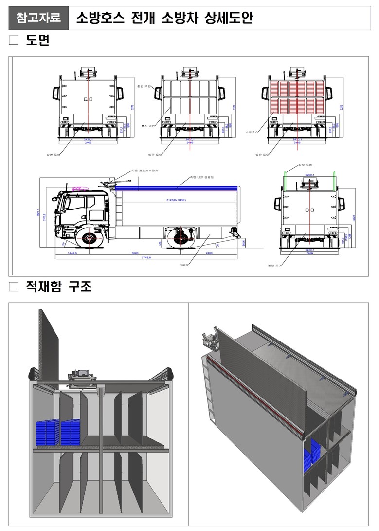 제안된 ‘소방호스 전개 소방차’는 4륜 구동 5톤 트럭(일반 펌프차 규모)을 기반으로 제작되며, 적재함 내부를 가변식 구조로 설계해 소방 호스(65mm×30m 기준) 135본을 적재할 수 있다.