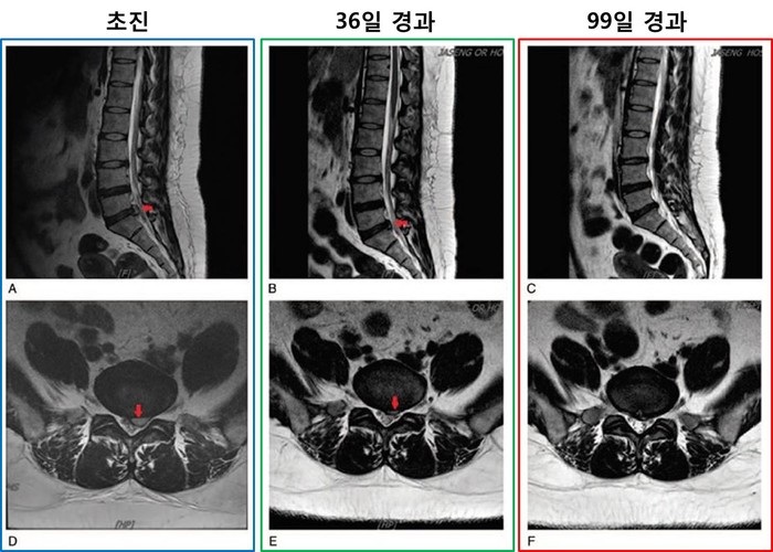 그 결과 한·양방 비수술 통합치료를 실시한 지 36일이 지난 1차 평가시점에서 영상의학적으로 유의미한 디스크 낭종의 흡수를 확인할 수 있었고, 99일인 2차 평가에서는 디스크 낭종이 완전히 흡수된 것을 볼 수 있었다. 환자의 요통과 하지방사통의 정도는 초진 당시 NRS 8점 수준이었지만, 치료 한 달 후에는 NRS 1점 수준으로 떨어졌고, 3개월 이후에는 NRS 0점 수준까지 감소해 통증이 완전히 없는 상태에 이르렀다.