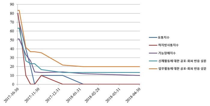 신체활동과 업무활동에 대한 FABQ도 치료 2개월 이후부터는 지수가 6점 수준에서 1점 수준으로, 8점 수준에서 2점 수준으로 각각 감소했다. 디스크 낭종 흡수에 따른 통증 감소로 일상생활의 장애가 유의미하게 해소된 것이다.