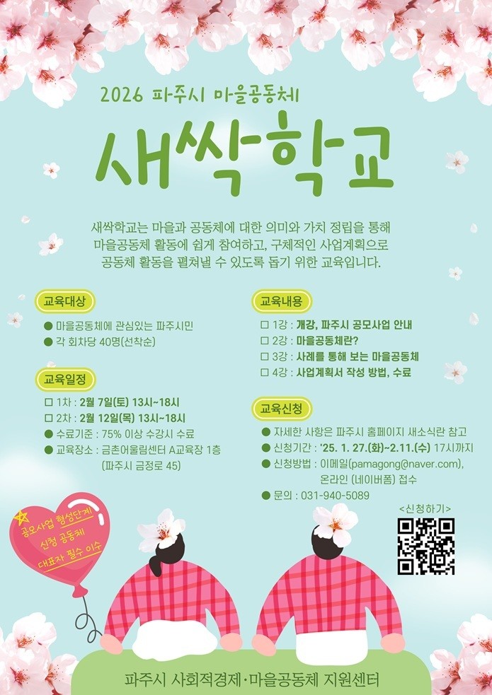 아울러 시는 마을미디어형과 기본사회형 지정공모를 신설해 지원 분야를 확대했으며, 마을공동체지원센터를 통해 2월 23일까지 사업계획서 작성을 지원하는 개별 자문도 병행할 예정이다. 신청은 파주시 사회적경제·마을공동체 지원센터 누리집(https://sm.paju.go.kr)에서 가능하다.