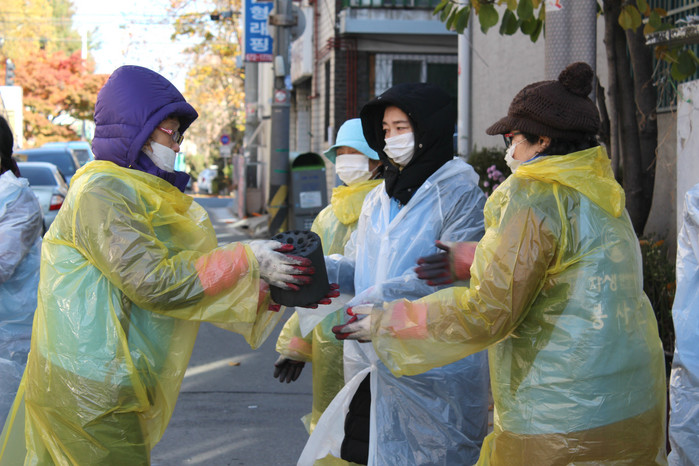 | ▲부천자생한방병원 자생봉사단원들이 지난 18일 부천시 약대동 일대에서 연탄 나눔 봉사활동을 하고 있다. |