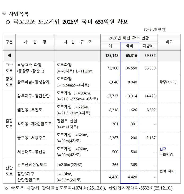 2026년도 도로사업 중 국비 653억원은 지난해보다 283억 원(76.5%) 증가한 것이며, 광주시는 여기에 지방비 598억원을 함께 투입해 도심 교통혼잡 해소를 위한 기반을 마련한다.
