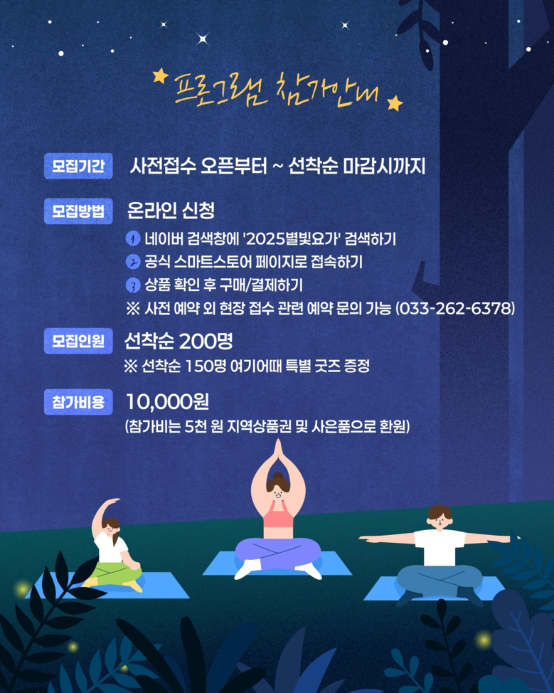 강원관광재단 최성현 대표이사는 “별빛 요가는 단순한 요가 수련을 넘어 자연 속에서의 휴식과 회복을 추구하는 웰니스 야간관광 콘텐츠로 자리매김할 것”이라며, “앞으로도 강원특별자치도만의 특색 있는 관광 프로그램을 지속 발굴·운영해 나가겠다”고 밝혔다.