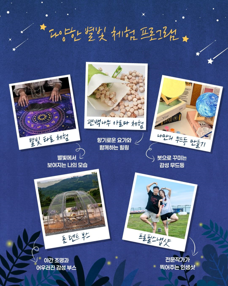이번 ‘별빛 요가’ 행사는 가족 단위로 참가할 수 있도록 기획되어 남녀노소 모두가 함께 즐길 수 있는 프로그램으로 풍성하게 구성되었다. 요가와 명상 외에도 참가자들은 자연과 예술이 어우러지는 다양한 체험 프로그램을 자유롭게 즐길 수 있다. 붓으로 꾸미는 나만의 무드등 만들기, 편백나무 아로마 체험, 전문 사진사가 찍어주는 프로필 촬영, 별빛 타로 등은 각기 다른 매력을 가진 활동들로 참가자들이 창의적인 경험을 쌓고 특별한 추억을 만들 수 있도록 한다. 또한, 주한인도문화원의 까탁 댄스 공연과 퓨전국악밴드 그라나다의 공연으로 행사의 시작을 장식하며, 참가자들에게 문화적 즐거움과 감동을 선사할 예정이다.