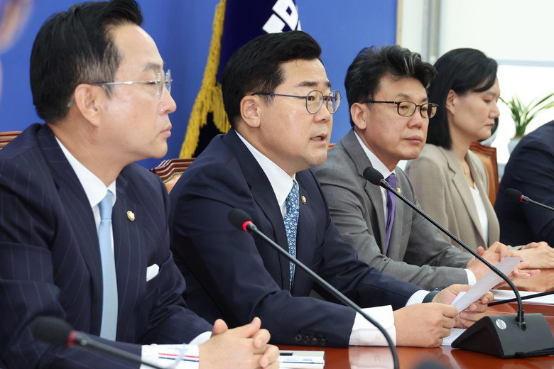 더불어민주당 박찬대 원내대표(왼쪽 두번째)가 20일 오전 서울 여의도 국회에서 열린 원내대책회의에서 발언하고 있다. 2024.8.20