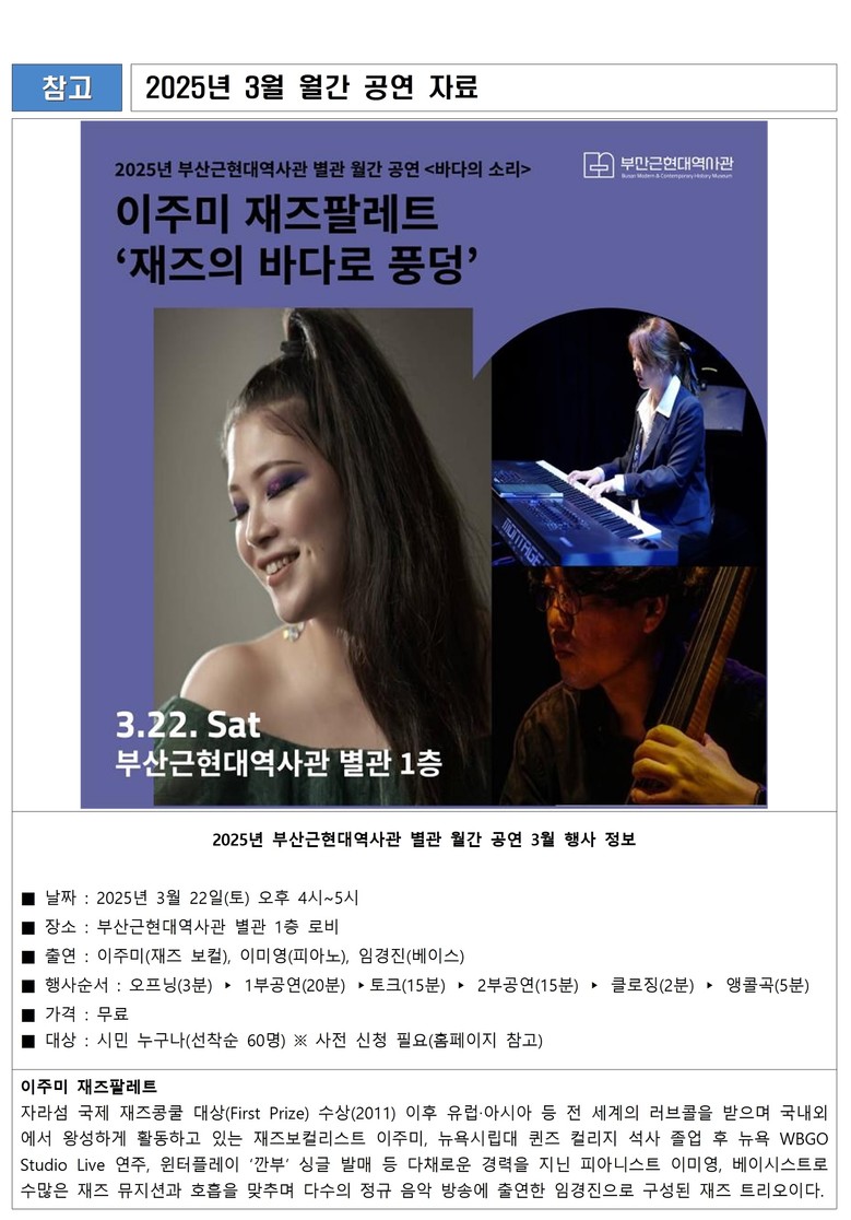 3월 공연은 '한국이 기다린 마지막 퍼즐 중의 하나'(재즈칼럼니스트 김현준)라고 평가받는 재즈보컬리스트 이주미를 주축으로 피아니스트 이미영, 더블베이스 임경진으로 구성된 '이주미 재즈팔레트'가 장식한다.