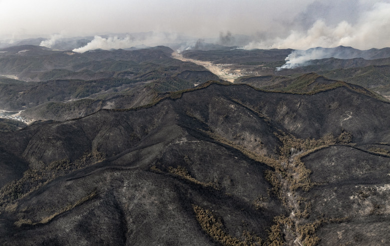 경북 의성군 산불 발생 나흘째인 25일 산불이 휩쓸고 간 의성군 산림이 폐허가 된 모습을 보이는 가운데 산불이 안동시 쪽으로 번져나가고 있다.