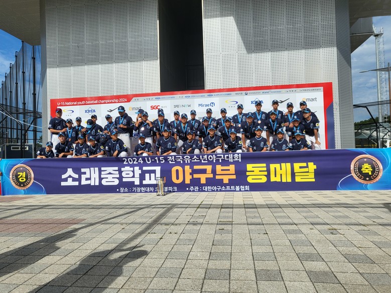 [시흥시 세계타임즈=송민수 기자] 소래중학교(학교장 장정재) 야구부가 올해 마지막 전국대회인 2024 U-15 전국유소년야구대회에서 3위를 차지했다. 2022년 시흥시에서 학교체육 단체 구기 종목 전국대회 첫 입상(3위 2회)을 시작으로 2023년 부산에서 열린 2023 U-15 전국유소년야구대회에서 3위에 입상한 바 있다. 소래중학교는 2024 양평군수기 경기도야구대회(U-15)에서 우승기를 들어올렸다.