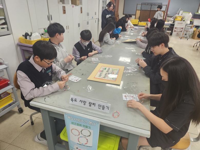 점심시간에는 학생자치회 주관의 다양한 활동들을 통해 독도가 우리 땅인 근거를 다각도로 살펴보는 시간을 가졌다. 학생들은‘독도는 우리땅’가사 팀별로 완벽히 외우기, 틀린 가사 수정해보기, ‘DOKDO’ 이니셜이 들어간 비즈를 넣어‘독도사랑 팔찌’ 만들기, ‘독도 생물을 찾아라’활동에 참여하며 독도를 사랑하는 마음과 더불어 독도는 우리 한국의 영토임을 다시 한번 확인하였다.