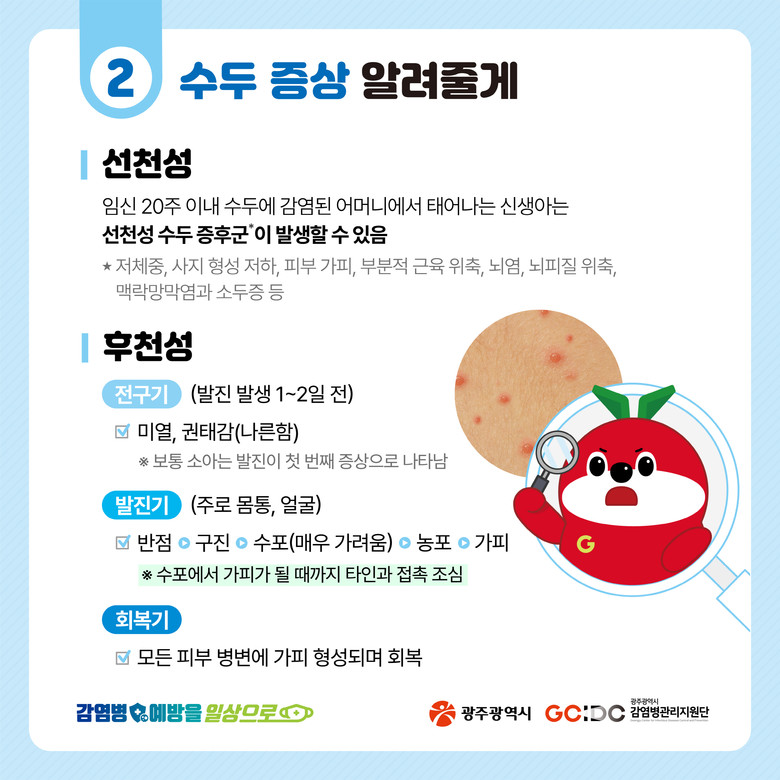 수두는 예방접종을 통해 감염을 사전에 막을 수 있으며, 감염이 되더라도 가볍게 앓고 지나갈 수 있으므로 영·유아 보호자는 생후 12~15개월에 예방접종을 놓치지 않는 것이 중요하다. 예방접종 시기를 놓쳤다면 가까운 지정 위탁의료기관에 방문해 접종을 완료하는 것이 필요하다.