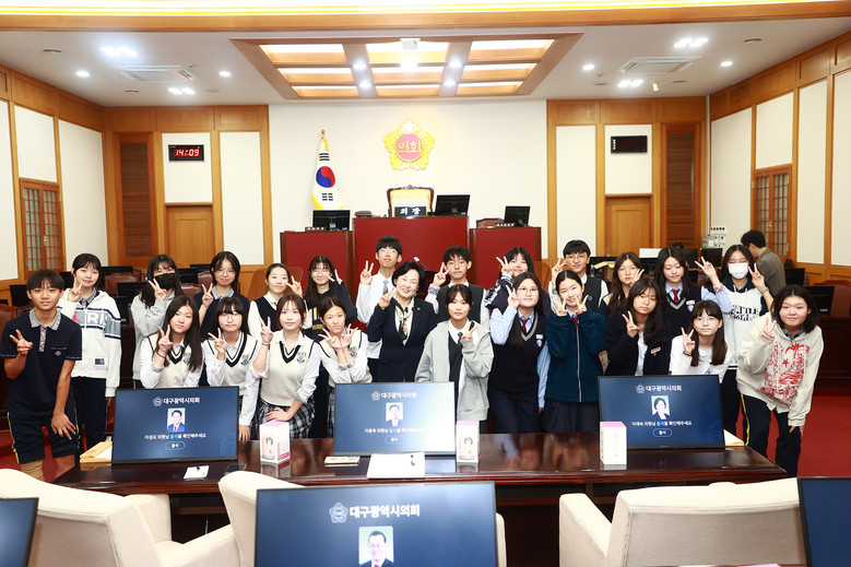 이재숙 의원은 학생들과 일일이 인사를 나누면서 “우리 청소년들이 꿈을 가지고 자라났으면 좋겠다. 이 꿈을 가지고 청소년들이 자유롭게 날개를 펼칠 수 있게 대구시의회가 열심히 봉사하도록 하겠다”고 말했다.