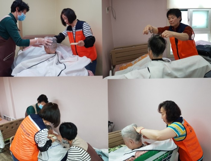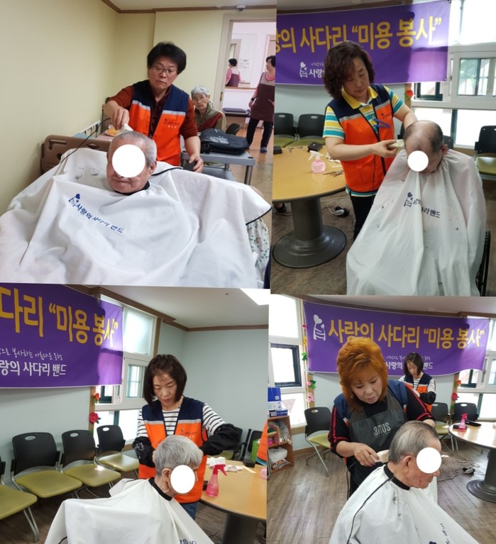 이날 미용봉사에는 송남석 단장을 비롯해서 김미경 이하영 조은숙 가위천사들이 1층과 2층에서 치매 및 와상 30명의 어르신들게 미용봉사를 하였다.