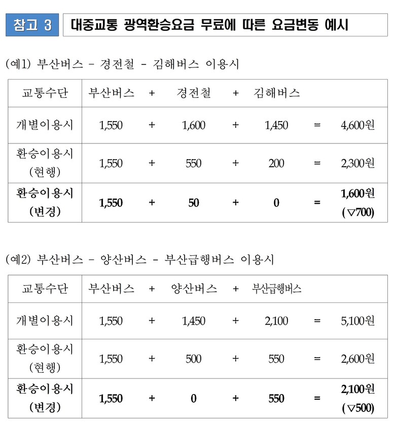 부산(버스, 도시철도)-김해(버스)-양산(버스)-경전철을 이용하는 시민은 추가 요금 없이 교통수단을 갈아탈 수 있다.
