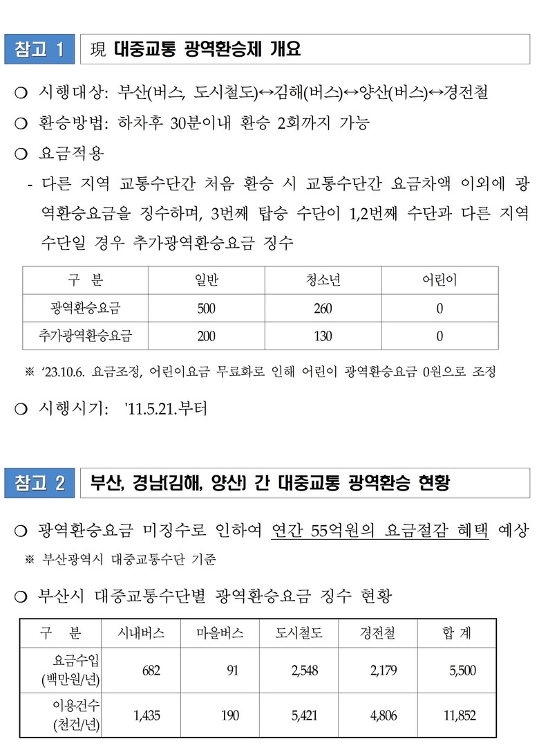 그동안 부산·김해·양산 간 버스 또는 도시철도 이용 시 환승 과정에서 발생하던 광역환승 추가요금은 시민의 교통비 부담을 가중하고 지역 생활권 통합을 저해하는 요인으로 지적됐다.