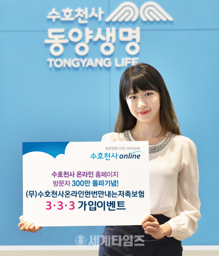 [세계타임즈 이채봉 기자]동양생명이 온라인보험 홈페이지 누적 방문 고객 300만명 돌파를 기념해 ‘(무)수호천사온라인한번만내는저축보험’ 가입 고객에게 3만원 상당의 상품권을 제공하는 ‘한번만내는저축보험 3-3-3 이벤트’를 시행한다.