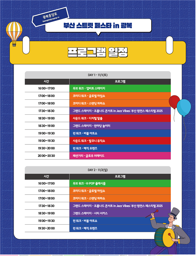 행사와 관련한 자세한 일정은 부산관광포털 비짓부산 누리집(visitbusan.net) 또는 행사 전용 채널(@b.streetfesta)을 통해 확인할 수 있다.