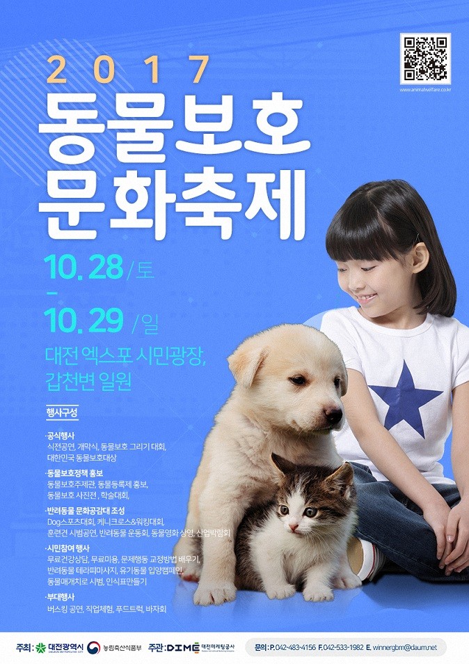 2017 동물보호 문화축제에 자세한 내용은 시청 농생명산업과(042-270-3831)로 문의하면 된다.