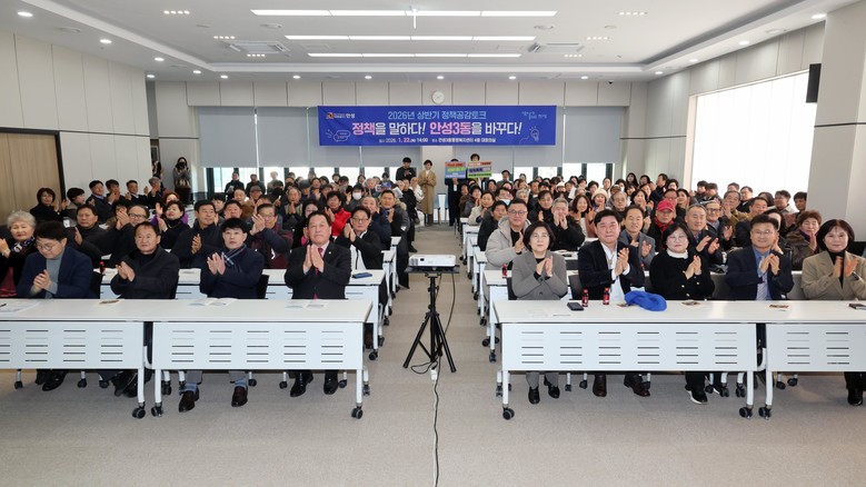 이번 정책공감토크는 2026년 안성시의 시정 운영 방향을 공유하고, 안성3동의 현안과 발전 방향을 주민들과 함께 만들어가기 위해 마련되었으며, 안성3동 주민자치센터 민요반의 식전 공연을 시작으로 시정 브리핑, 안성3동 현안 발표, 2025년 하반기 건의 사항 검토 결과 순으로 진행됐다.