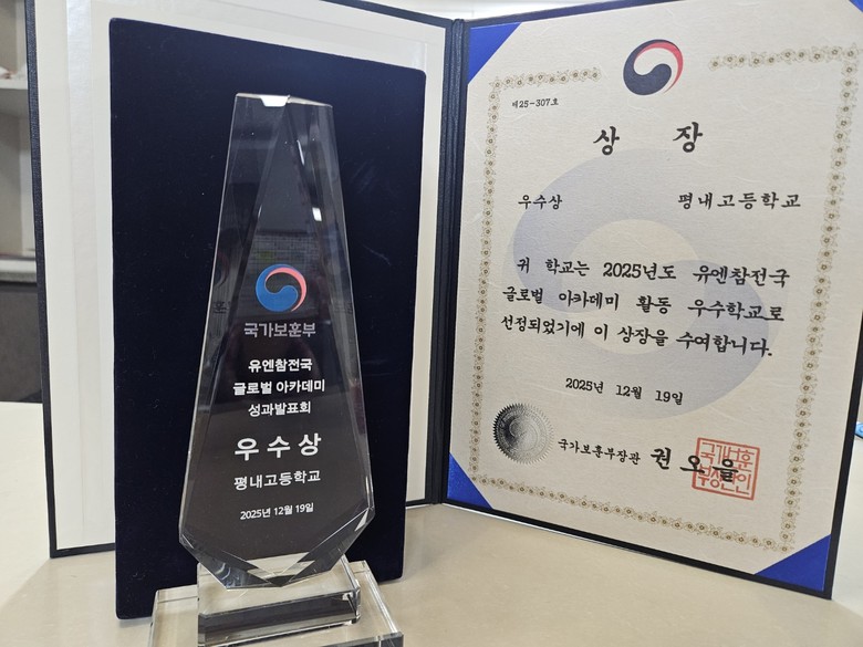 [남양주시 세계타임즈=송민수 기자] 평내고등학교(교장 이준호)가 지난 12월 19일 JW메리어트 동대문스퀘어 서울에서 개최된 '2025년 유엔참전국 글로벌 아카데미 성과발표회'에서 우수학교로 선정되어 국가보훈부 장관상을 수상했다.