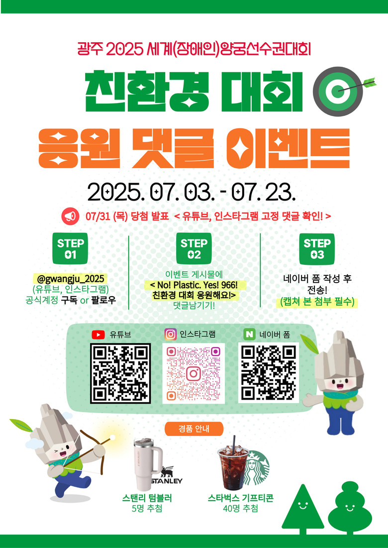 이번 이벤트는 대회 공식 사회관계망(SNS) 계정(유튜브 및 인스타그램 @gwangju_2025)을 통해 ‘친환경 대회 응원 댓글 달기’로 진행된다. 참여 방법은 대회 공식 계정을 구독(또는 팔로우)하고, 이벤트 게시물에 응원 댓글을 작성한 후 네이버 폼에 제출하면 된다. 이벤트 참여자 중 추첨을 통해 텀블러와 커피쿠폰을 증정한다.