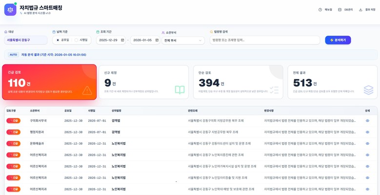 기존에는 수기 검색과 점검에 많은 인력과 시간이 소요돼 입법 시차가 발생하거나 누락의 우려가 있었으나, 이번 시스템은 569개 자치법규(조례·규칙)에 인용된 상위법령을 자동 데이터베이스화하고, 법제처의 개정 정보를 교차 분석해 각 자치법규에 미치는 영향을 긴급 검토, 신규 제정, 단순 참고 등으로 분류한다. 이를 통해 업무 효율성과 법령 관리의 신뢰성을 획기적으로 강화했다.
