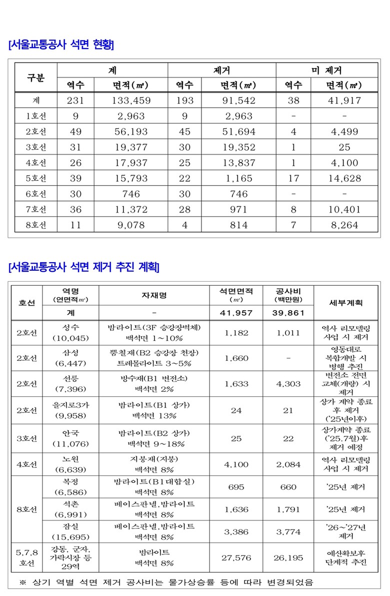 석면이 가장 많이 남아있는 노선은 5ㆍ7ㆍ8호선이다. 공사는 2027년까지 예산확보 후 단계적으로 추진할 계획이다. 공사비는 398억6100만 원이 소요될 예정이다.